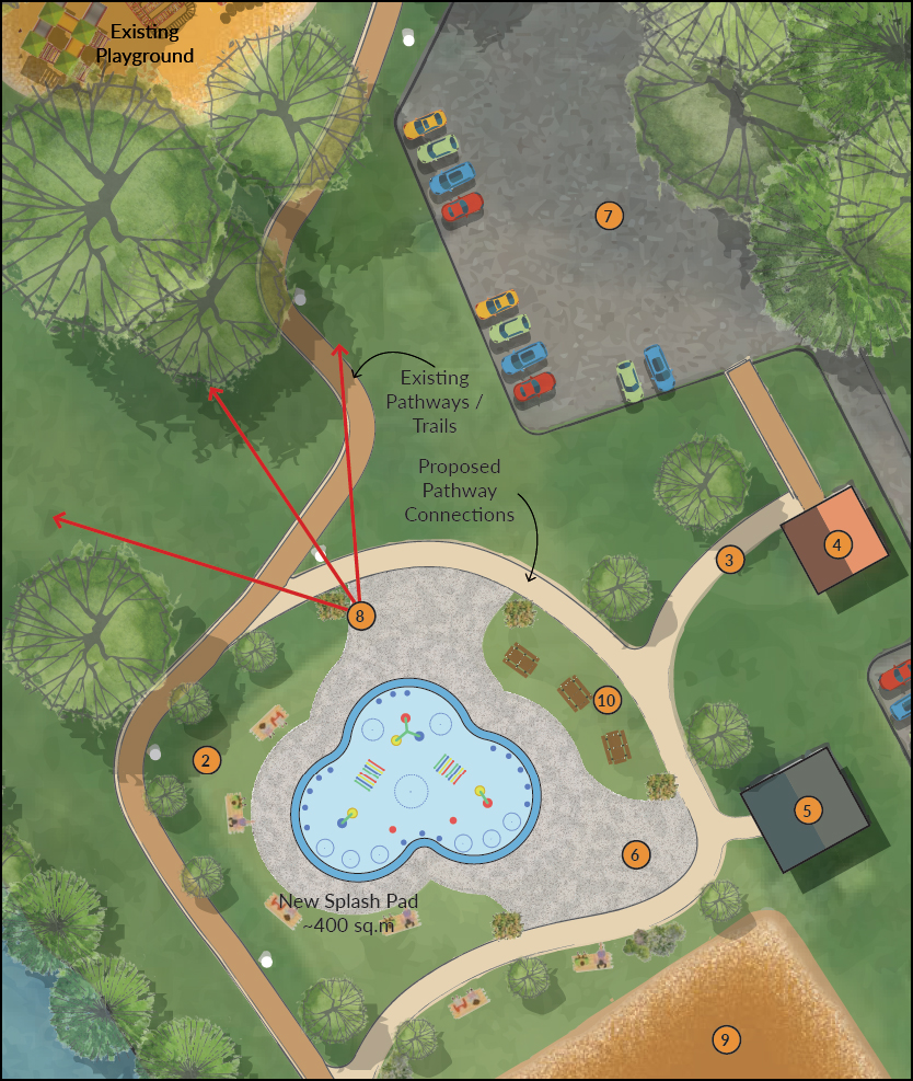• new pathway connections between the splash pad, washroom, and pavilion